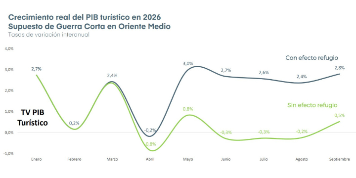 Traducido en cifras, y “siempre bajo el supuesto mencionado de guerra corta, acotada y de estabilidad”, Exceltur estima que “el efecto de destino refugio añada en España 2,0 puntos de PIB turístico al crecimiento de 2026 (4.239 millones €), compensando el efecto de pérdida de 1,9 puntos (4.045 millones €) asociado a los impactos económicos sobre los viajes y el gasto turístico”.