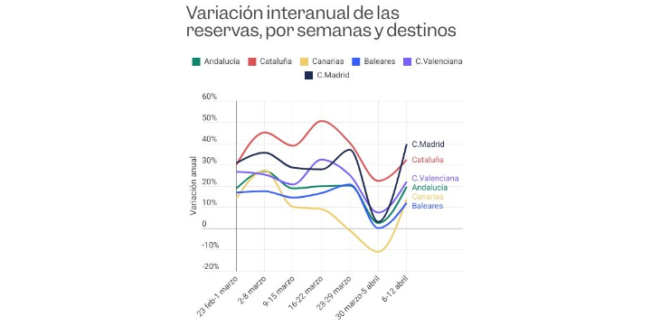 Variación anual de las reservas hoteleras (semana del 6 al 12 de abril)